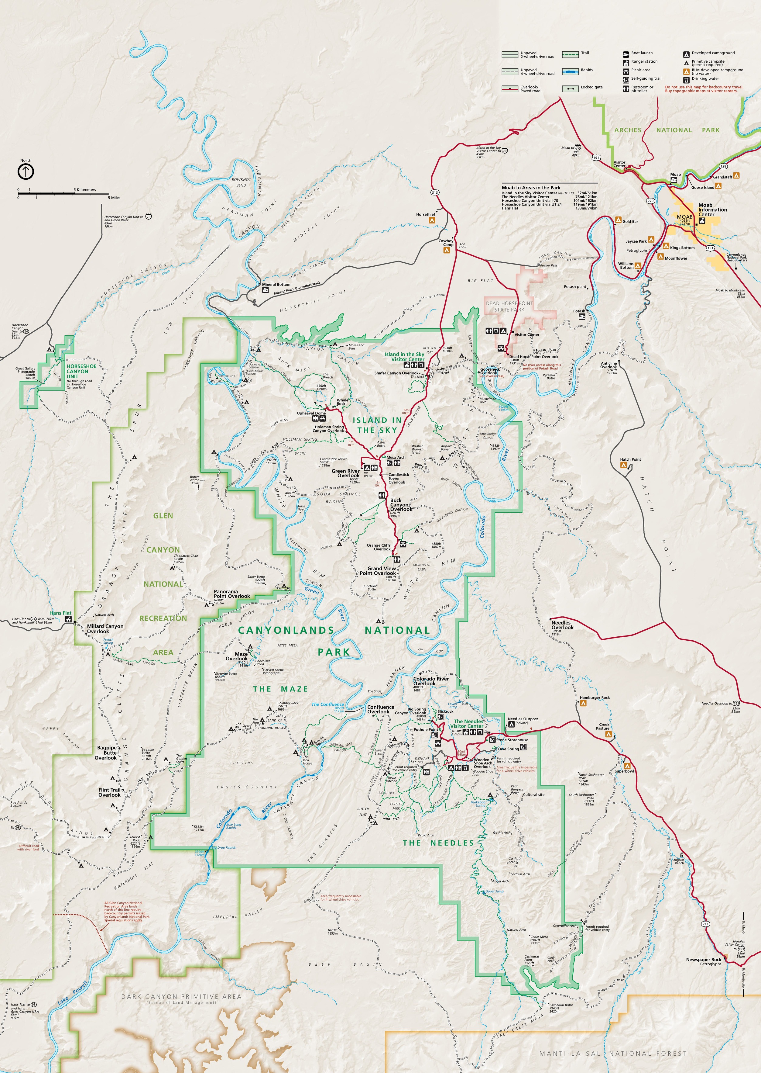 Beyond Island in the Sky, the park is isolated, requiring previous experience backpacking, and are often subject to acquisition of back-country permits. Many hikes are available in Island in the Sky, and its relatively close proximity to the town of Moab allows for restocking of supplies, but also access to numerous tours and activities in Canyonlands. White Rim Road offers 4x4 driving (with a permit required if you're using your own vehicle) and the Colorado River hosts rafting, with the Cataract Canyon section offering up to class V rapids.